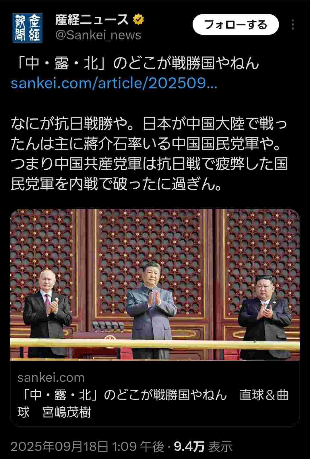 逆にこれで中共寄りな投稿してたらウヨ大困惑で面白かったのに - 28 : 2025/09/18(木) 16:21:13.69 ID:QcANJJUAH