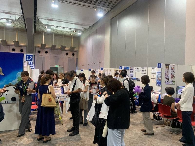 大阪・関西万博で働く人を対象とした合同企業説明会でブースに集まる来場者ら=大阪市住之江区で2025年9月14日、新宮達撮影