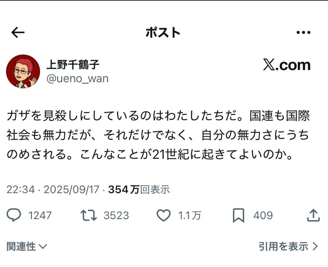 - 上野千鶴子は左翼とかフェミっていうより無政府主義者やからな