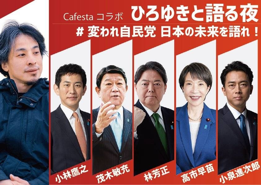 - 自民党は9月27日午後7時から、次期総裁選にあわせたネット討論企画「ひろゆきと語る夜 #変われ自民党 日本の未来を語れ!」をYouTubeで生配信する。元2ちゃんねる管理人として知られるひろゆき(西村博之)さんが進行役を務め、総裁候補5人に視聴者からの質問をぶつける内容で、同党の公式チャンネルおよびひろゆきさんのチャンネルで同時配…
