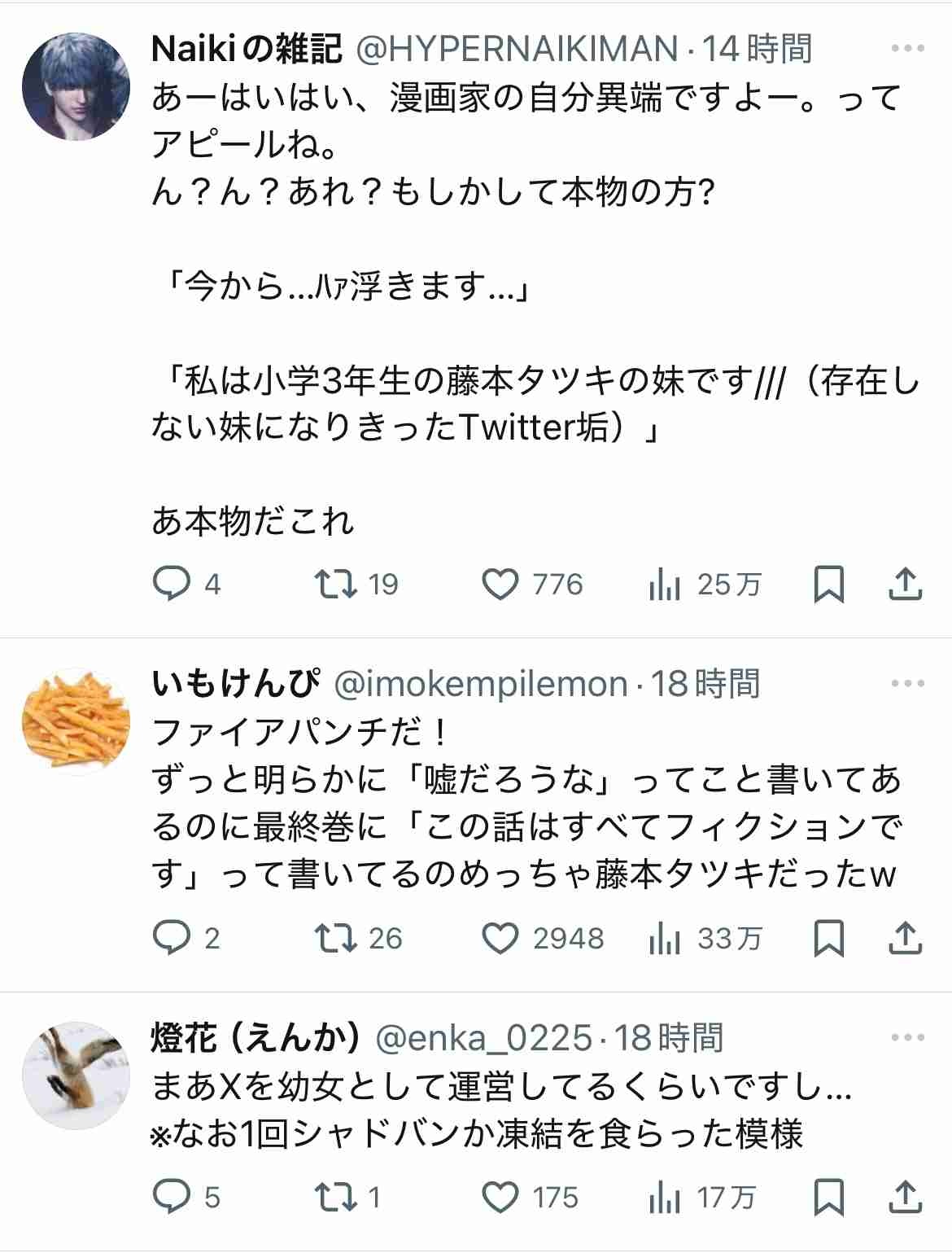 ジャンプの本誌組に必死にサポートしてもらったチェンソーマン1部が当たっただけでその前後のファイアパンチと2部は終わってるしそこも微妙だろ - 12 : 2025/09/25(木) 18:05:18.26 ID:CH3R4hs+0