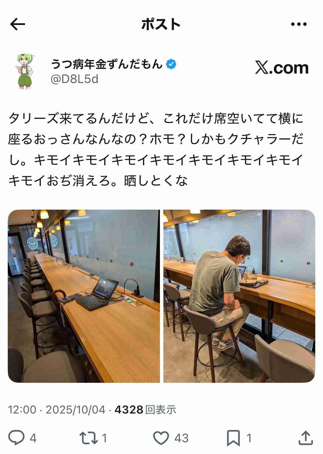 投稿主も隅っこ好きで先にいたんやろうし - 19 : 2025/10/04(土) 13:14:49.489 ID:j7wtyxd.4