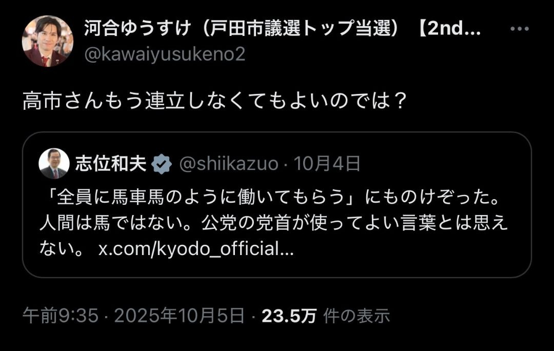 - 高市さん(もう公明党と)連立しなくていいのでは