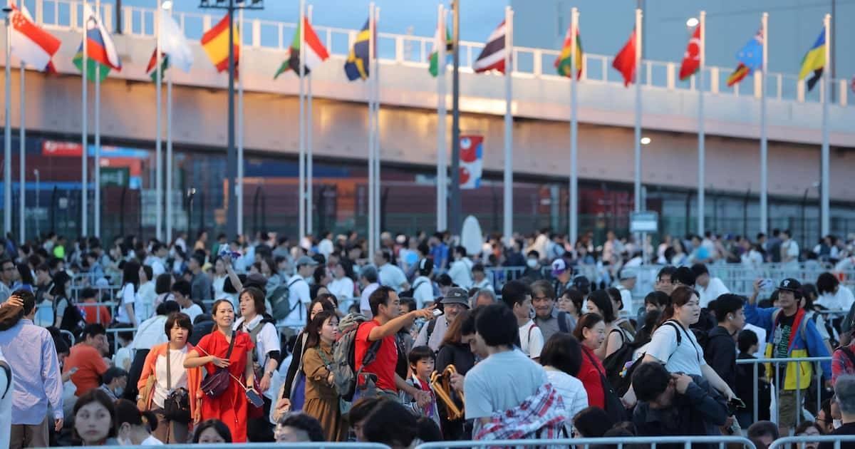 夢洲駅直結の東ゲート前は開場約3時間前の午前6時の時点ですでに多くの人でにぎわい、行列ができた。