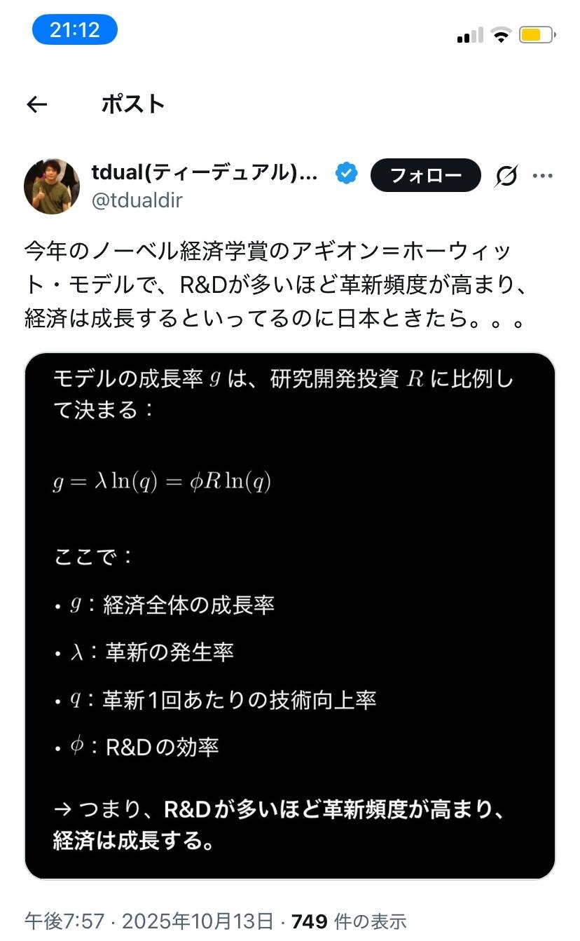 このモデルは、技術進歩を外生的(外部から与えられるもの)と見なしていた初期の経済成長論に対し、内生的(経済システムの中で決まるもの)なものとして捉え、イノベーション政策や競争政策の設計に大きな影響を与えました。 - 23 : 2025/10/13(月) 21:23:55.21 ID:f/P3p0uKH