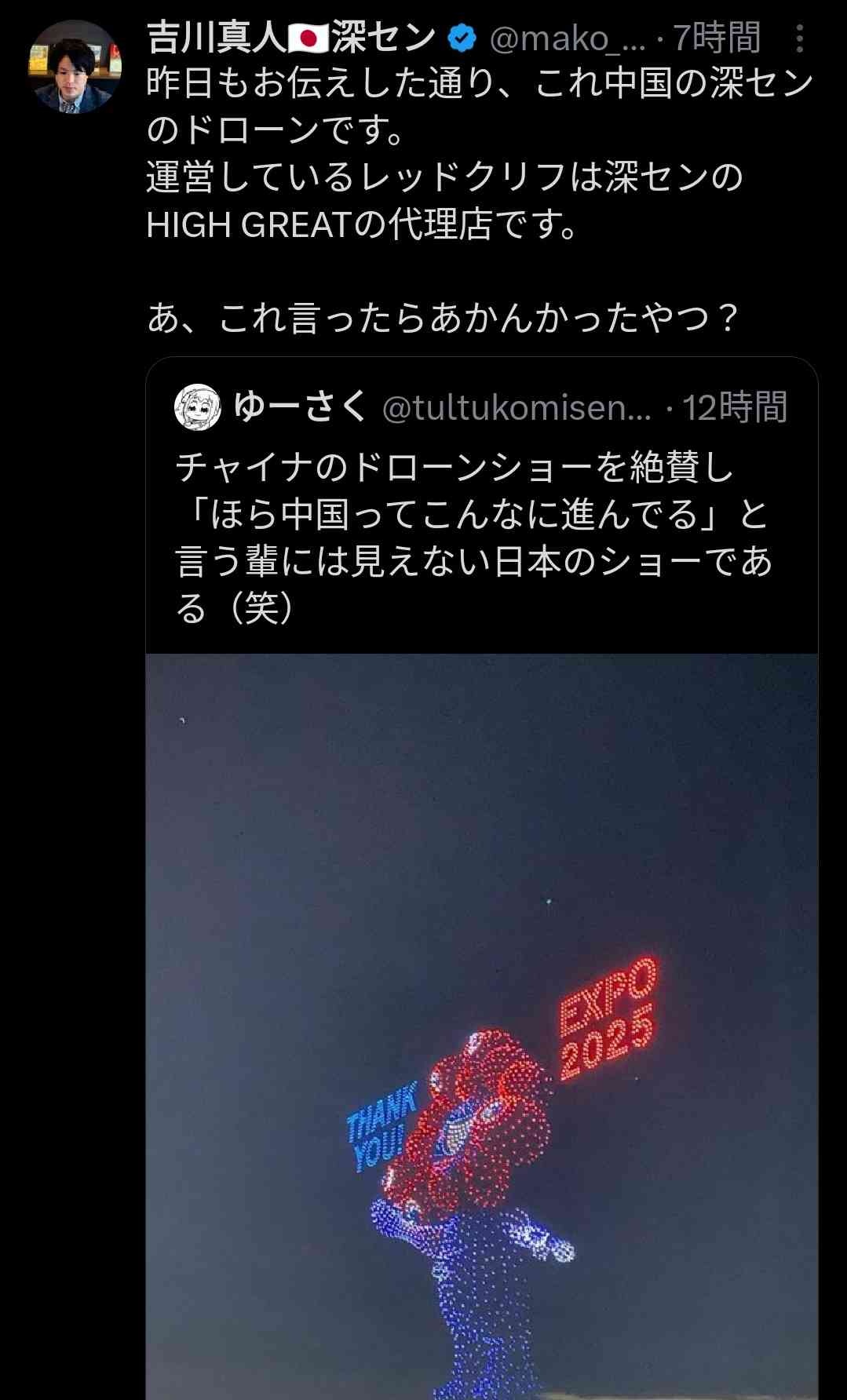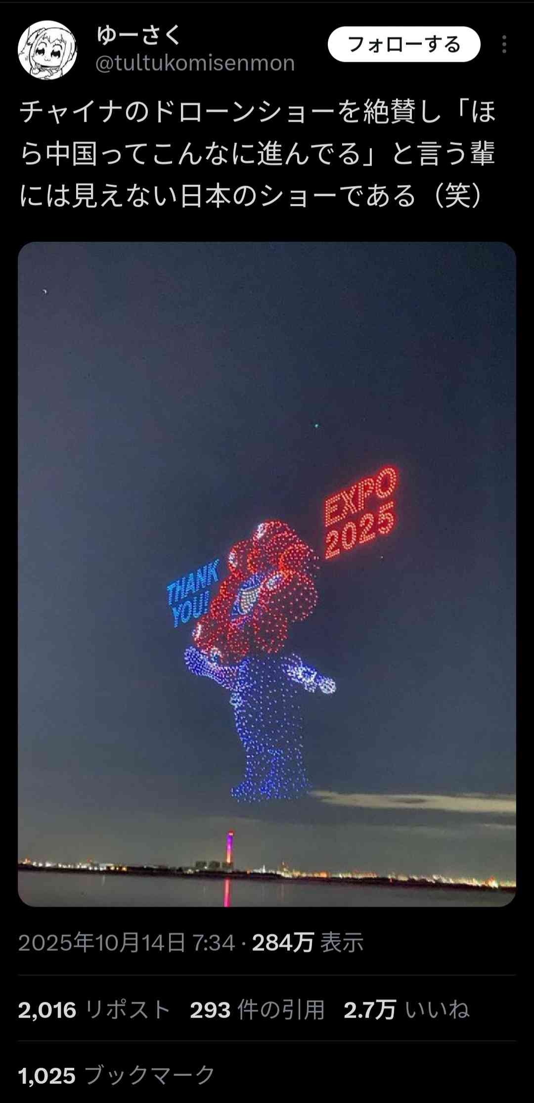 日本の万博なんやから日本の技術力見せつけるために国産ドローンに決まってるやん - 14 : 2025/10/14(火) 20:28:15.874 ID:ipERsWRxp
