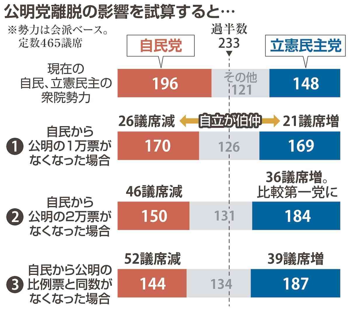 - 連立解消で公明票失えば、自民の議席数は立民と伯仲