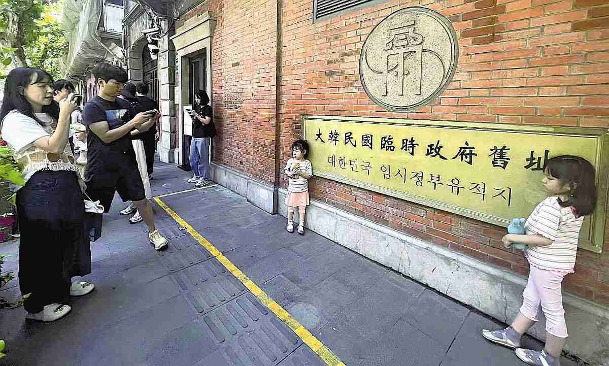 韓国人に人気の大韓民国臨時政府旧跡で記念撮影する韓国人旅行者(10日、上海市で)=田村美穂撮影