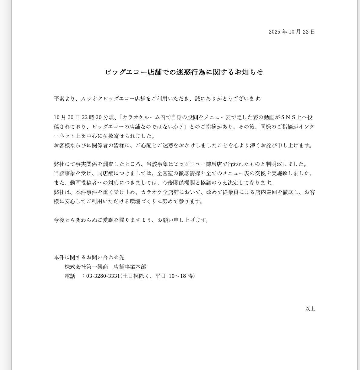 - ビッグエコー店舗での迷惑行為に関するお知らせ 平来より、カラオケビッグエコー店舗をご利用いただき、誠にありがとうございます。 10月20日22時30分頃、「カラオケルーム内で自身の股間をメニュー表で隠した姿の動画がSNS上へ投 高されており、ビッグエコーの店舗なのではないか?」とのご指摘があり、その後、同様のご指摘がインターネット上を中心に多数寄せられました。 お客様ならびに関係者の皆様に、ご心配とご迷惑をおかけしましたことを心より深くお詫び申し上げます。 弊社にて事実関係を潤在したところ、当該事象はビッグエコー練馬店で行われたものと判明致しました。 当該事象を受け、同店舗につきましては、全容室の徹底清掃と全てのメニュー表の交換を実施致しました。 また、動画投稿者への対応につきましては、今後関係機関と協議のうえ決定して参ります。 弊社は、本件事件を重く受け止め、カラオケ全店舗において、改めて従業員による店内巡回を徹底し、お客様に安心してご利用いただける環境づくりに努めて参ります。 今後とも変わらぬご愛顧を賜りますよう、お願い申し上げます。