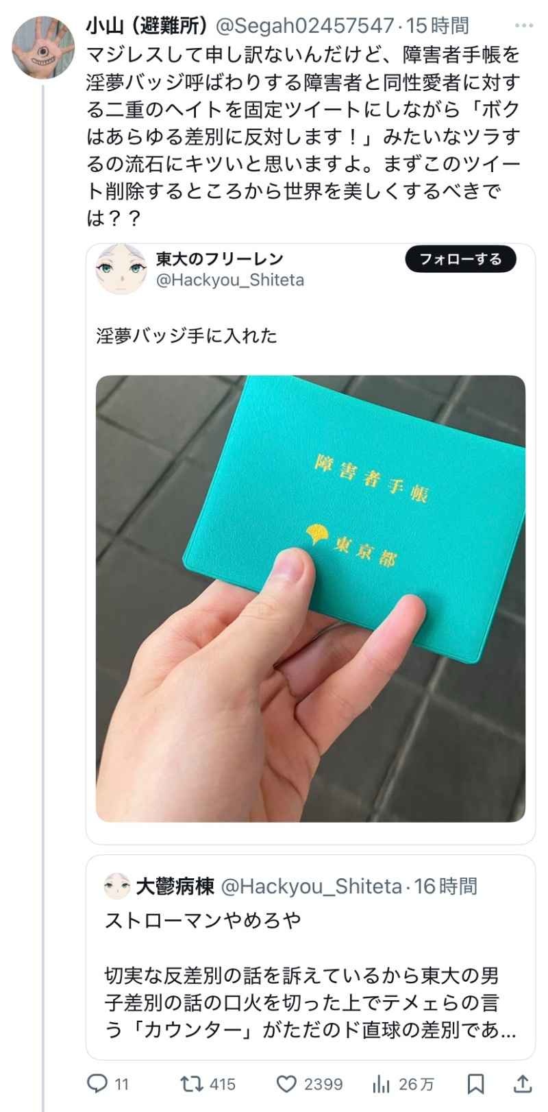 - 障がい者手帳より、小山(狂)をブロックせずにわざわざ引用リツイートしてる方がよっぽど淫夢バッジだろ��🤣🤣🤣🤣