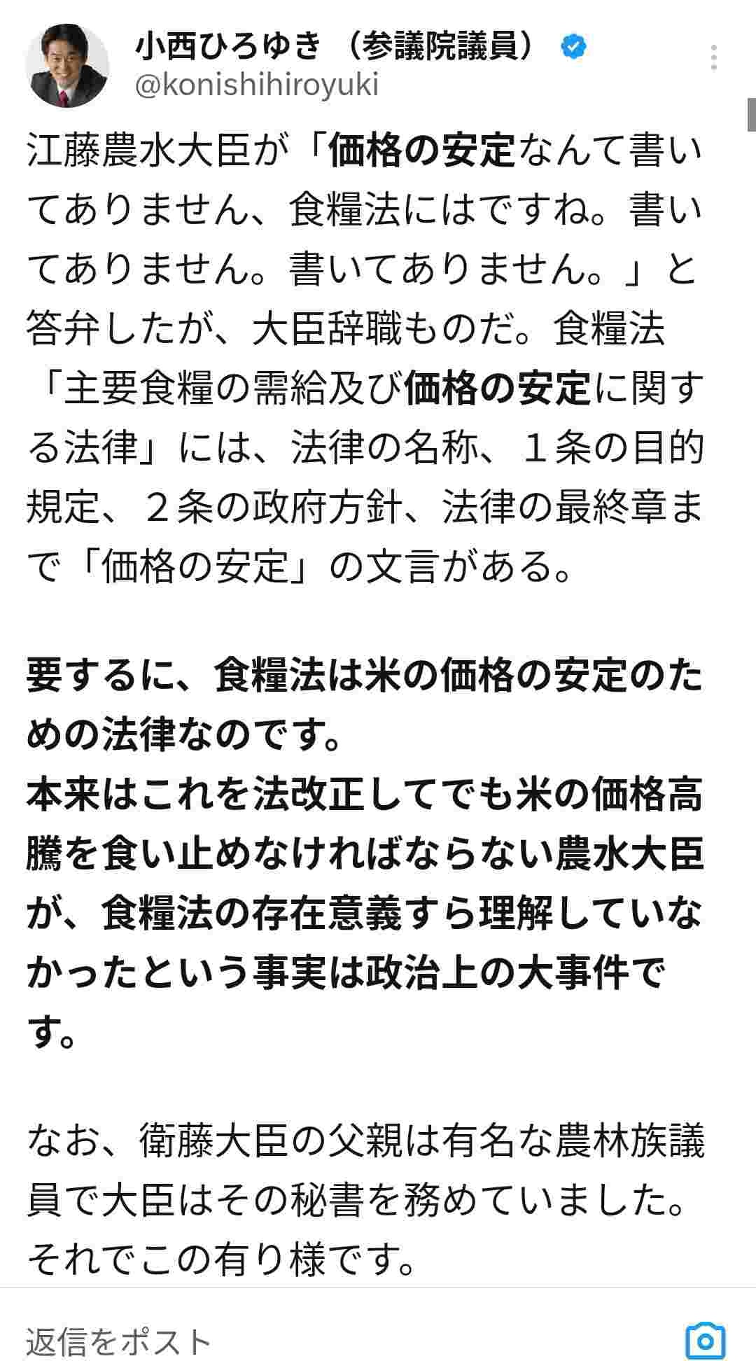 小西「食糧法では安定した価格で出さないといけないし価格の高騰を食い止めるのが農水大臣の役目」 - 41 : 2025/10/23(木) 18:26:05.377 ID:aJ1ORZCDM