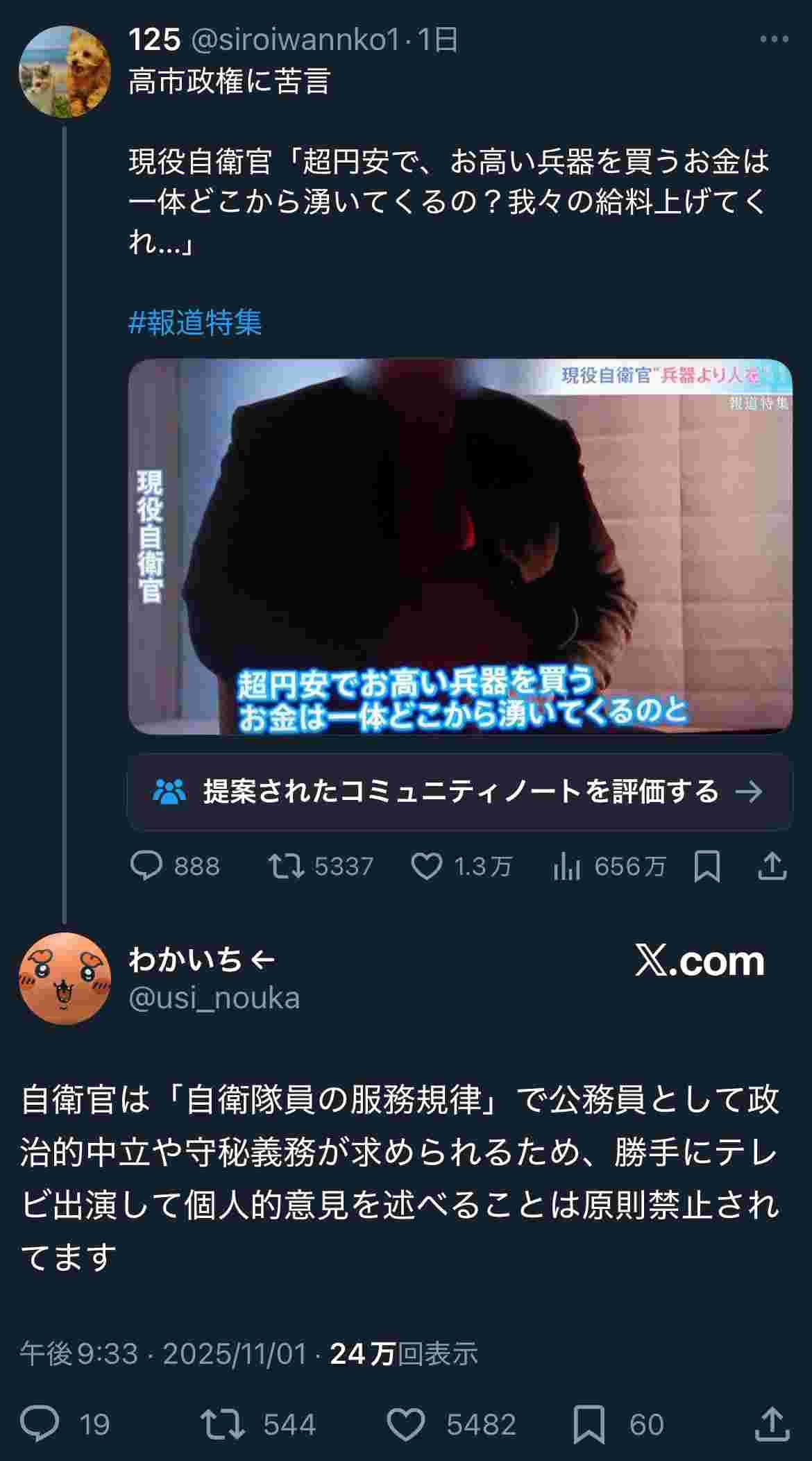 自衛官たるものがテレビに出て待遇への不満なんか言うはずないからテレビが反日デマ流してると - 14 : 2025/11/03(月) 14:04:09.444 ID:5syehqJbp