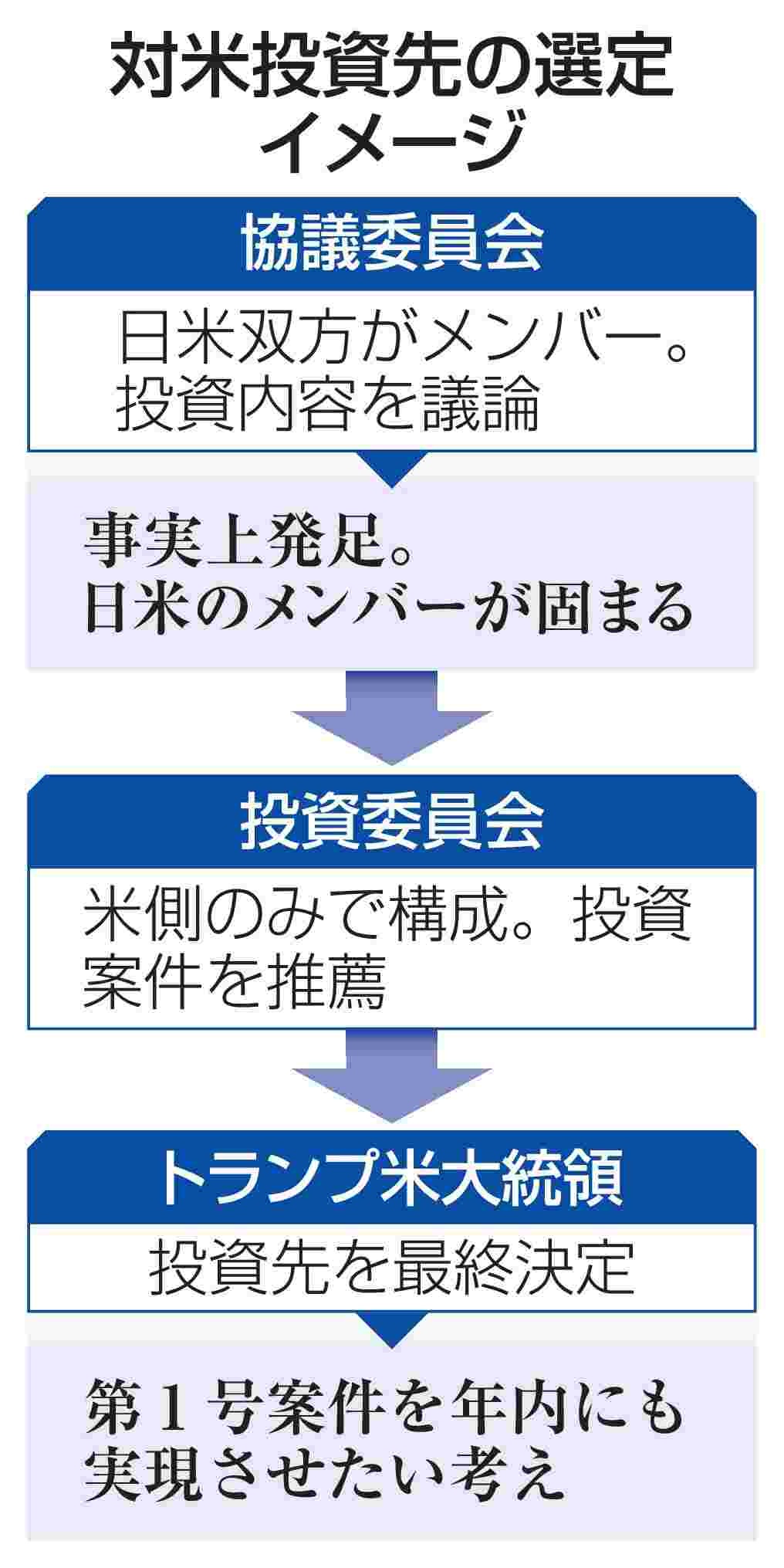 - 日米両政府が9月に公表した対米投資の覚書によると、投資先は米側のみでつくる投資委員会が案件を推薦し、最終的にはトランプ米大統領が決める。