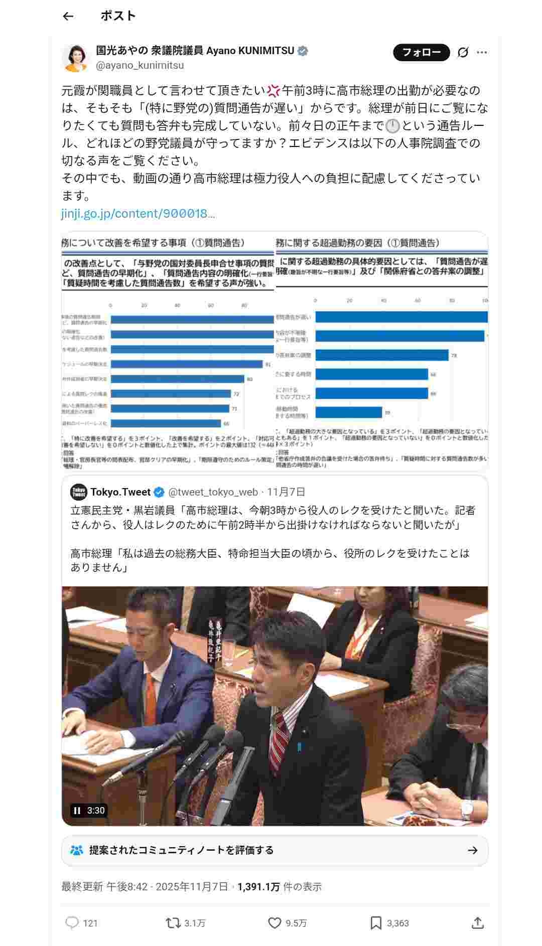 - 「高市総理が午前3時に出勤が必要なのは野党の質問が遅いせい!!!野党はルールを守ってないの!!!」→日本中のネットで高市支持者たちが一斉に野党叩きが始まる