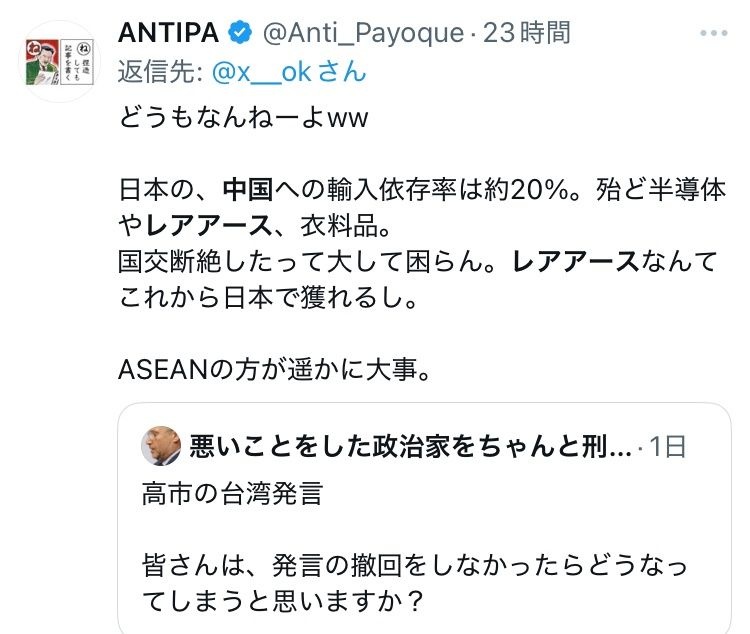 - 日本の中国依存率20%ってしかって言っていいんか?