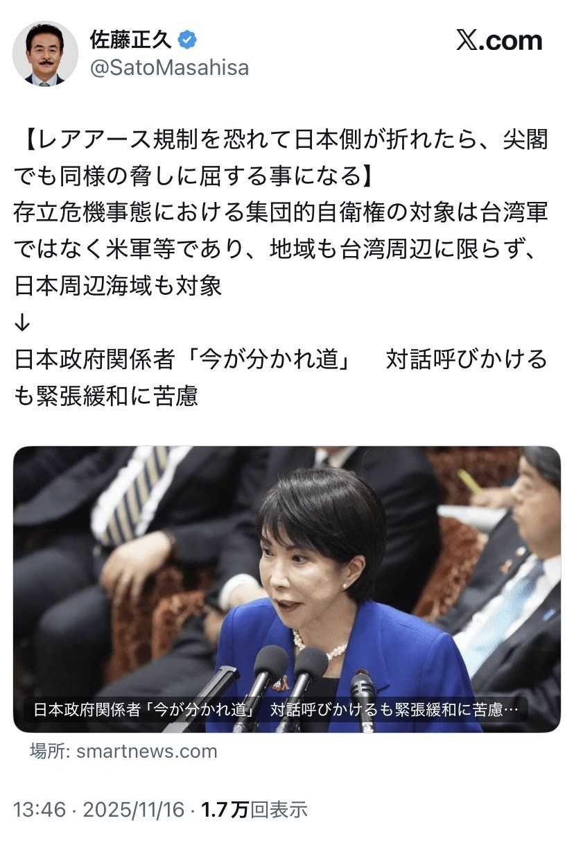日本政府関係者「今が分かれ道」 対話呼びかけるも緊張緩和に苦慮(共同通信) - Yahoo!ニュース日本政府は、高市早苗首相の国会答弁に対する中国の反発激化に苦慮している。中国が求める首相答弁の撤回は「到底、応じることはできない」(政府筋)と拒否する一方、対抗措置がレアアース輸出規制といった経済news.yahoo.co.jp - 3 : 2025/11/16(日) 18:37:48.06 ID:/zuEsQSB0