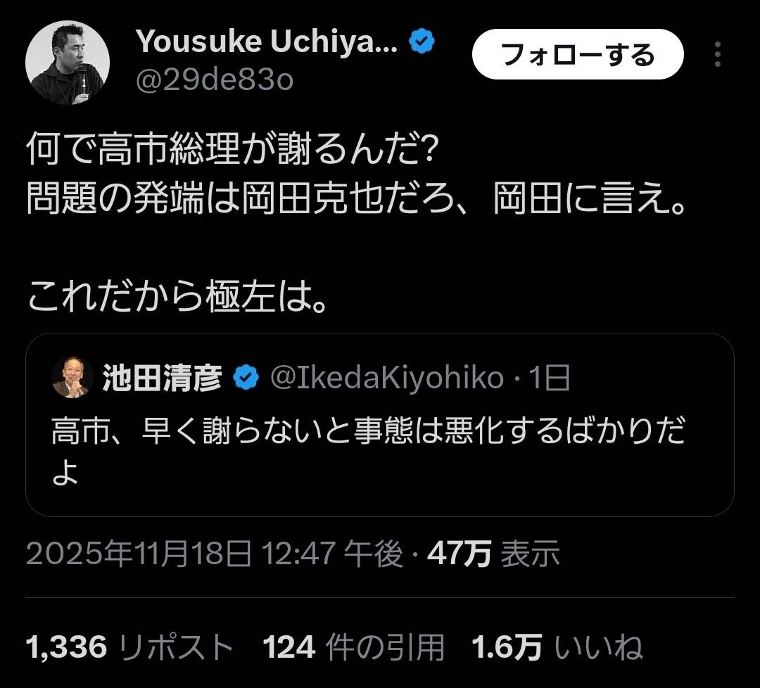 最初はジョークだと思ってたけどあまりに撤回しないんでじゃあそろそろ本気出すかっていう - 93 : 2025/11/18(火) 20:28:45.35 ID:gU6dIqlC0