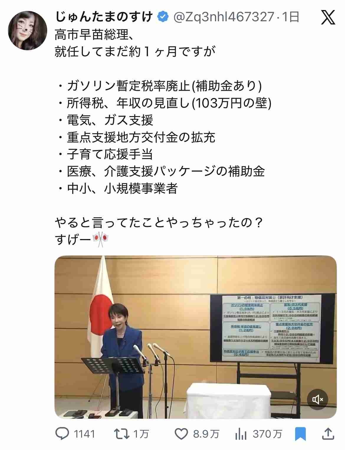 じゅんたまのすけ (@Zq3nhl467327) on X高市早苗総理、 就任してまだ約1ヶ月ですが ・ガソリン暫定税率廃止(補助金あり) ・所得税、年収の見直し(103万円の壁) ・電気、ガス支援 ・重点支援地方交付金の拡充 ・子育て応援手当 ・医療、介護支援パッケージの補助金 ・中小、小規模事業者 やると言ってたことやっちゃったの? すげー🎌x.com - 2 : 2025/11/23(日) 09:33:43.90 ID:UlzlflKP0