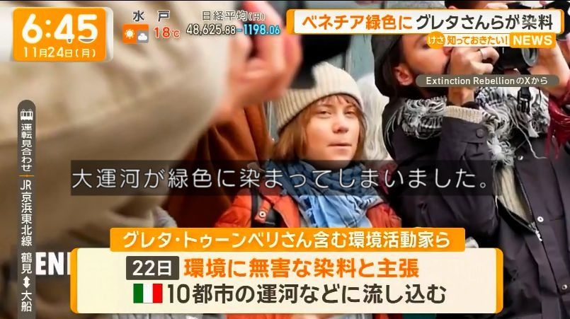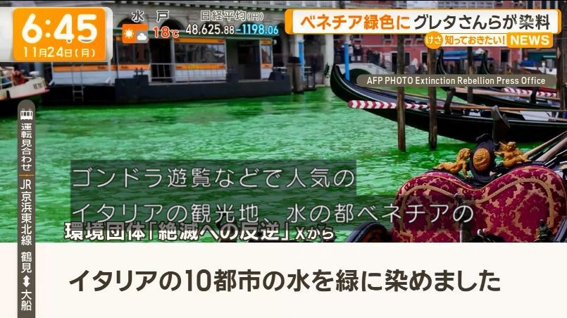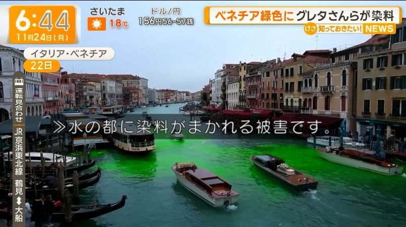 ベネチアの運河が緑に、環境活動家が抗議で染料流し込む【11月23日 AFP】スウェーデンの環境活動家グレタ・トゥンベリさんを含む気候活動家が22日、イタリア・ベネチアのカナル・グランデ(大運河)を緑色に染めた。これは、ブラジルで行われた国連気候変動枠組み条約第30回締約国会議(COP30)で、化石燃料の段階的廃止という重要課題をめぐり各国が合意に至らず苦慮している最中の...www.afpbb.com - 2 : 2025/11/24(月) 11:38:29.51 ID:Hvtj6sPB0