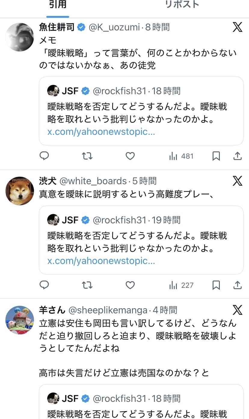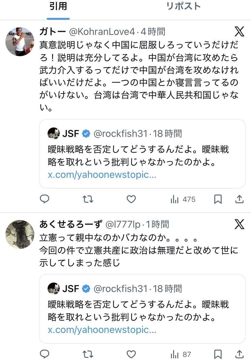 - こいつの中で「高市の真意=台湾の独立を認めて中国と戦争する」だと思ってて立憲もそう認識しているに違いないっていう誤謬でしょ