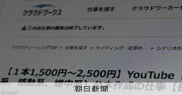 「中国批判系」「嫌中系」をうたう動画の制作を依頼する募集が、仕事仲介大手「クラウドワークス」(東京)のウェブサイト上に掲載され、同社が3日、仕事依頼を非公開にする措置をとった。同社によると、ガイドラインで禁止する「事実誤認や印象操作がおこなわれる恐れがある依頼」「差別や誹謗(ひぼう)中傷につながる依頼」などに該当する可能性が高いと判断したという。