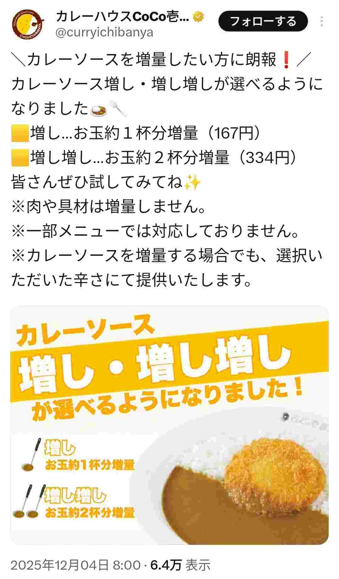 個人店のが値段もクオリティーも良いのCoCo壱くらいだろ - 53 : 2025/12/06(土) 09:06:54.259 ID:QrVEBCEq0