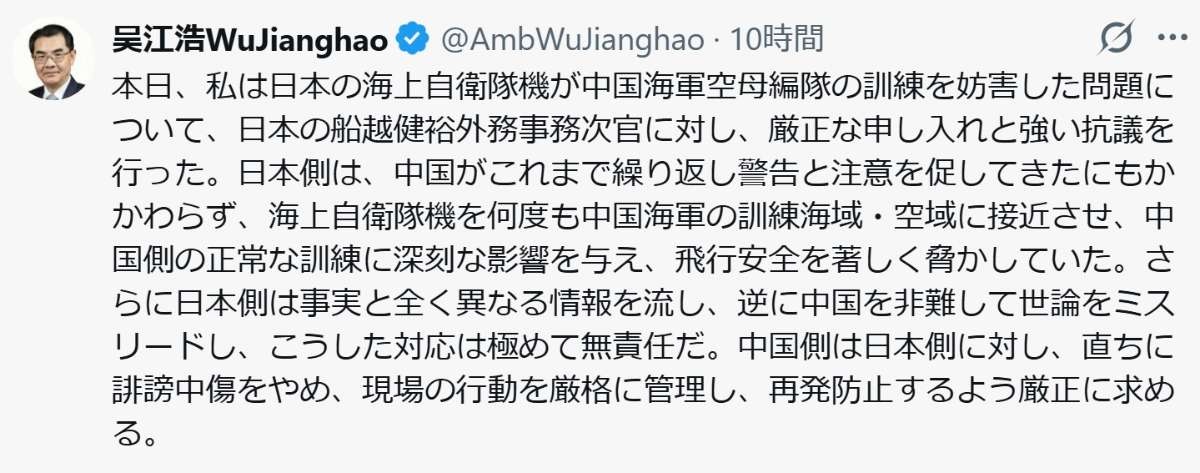 中国駐日大使、レーダー照射巡り逆ギレ主張「日本側は飛行安全を著しく脅かしていた」に反論殺到(日刊スポーツ) - Yahoo!ニュース中国の呉江浩駐日大使が7日夜、自身のX(旧ツイッター)を更新。中国軍機による自衛隊機へのレーダー照射事案について、中国側の“主張”を展開した。 小泉進次郎防衛相は7日未明に臨時記者会見を開き、news.yahoo.co.jp - 2 : 2025/12/08(月) 13:17:24.90 ID:tN8X9pc70