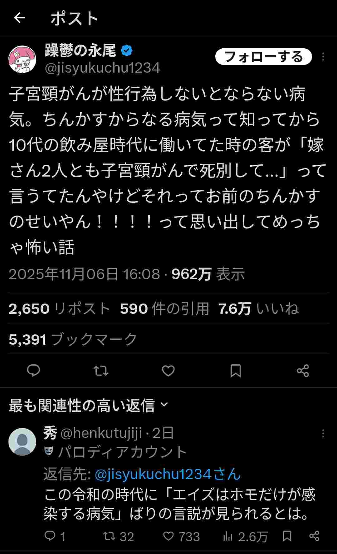 「子宮頸がんになるHPVウイルスは男のチンカスが生み出してる」とかめちゃくちゃなデマもあるし - 50 : 2025/12/10(水) 21:53:00.282 ID:uaLkkBzlB