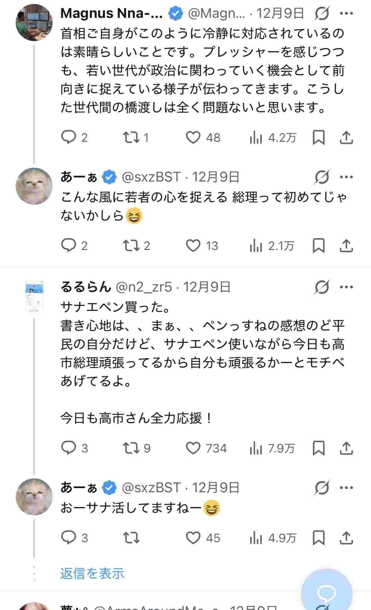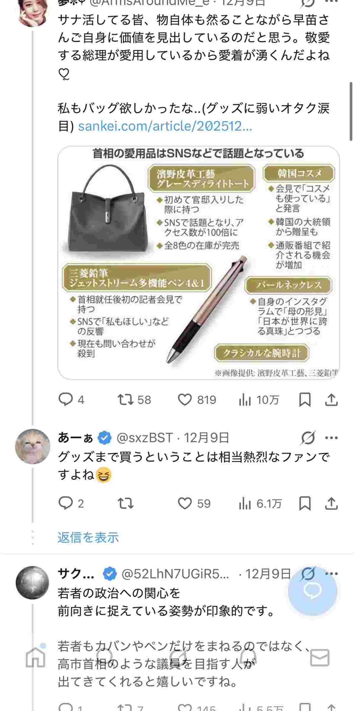 Q.若い世代のサナ活についてどう思うか高市総理「サナ活については聞いております。私が持っているカバンとかペンとか買っておられる方もいると聞いております。洋服はたくさん持ってないので結構プレッシャーにもなっております。若い方が政治に興味を持って頂けるきっかけになるんであれば嬉しい」