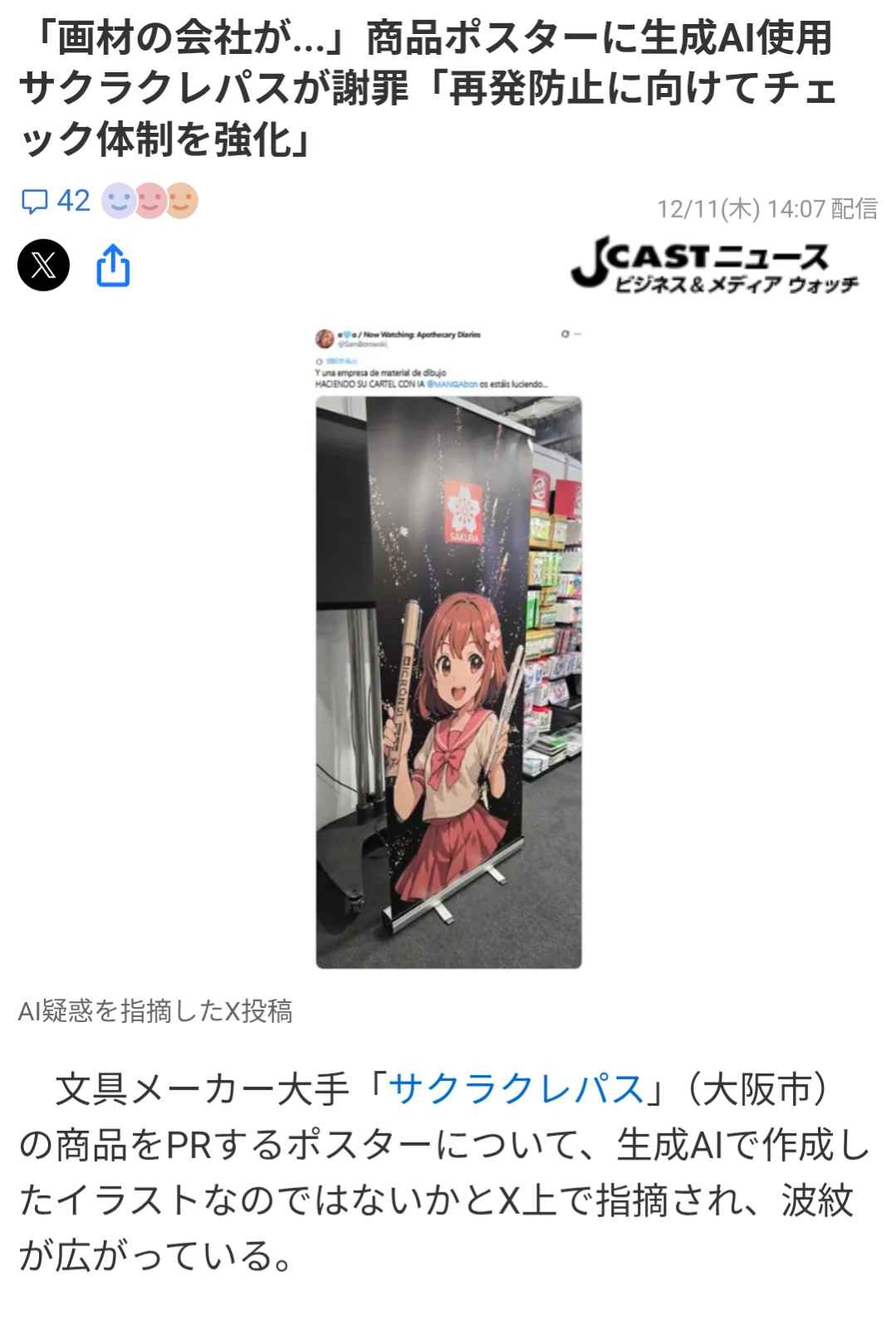 - 老舗文具メーカーのサクラクレパスは「Manga Barcelona」(マンガバルセロナ)で使用したポスターについて「生成AIで制作されていた」と公表した。同ポスターを巡っては、X上で「AIで作ったものではないか」との疑惑が浮上。9日に、ポスターの使用を停止するとの声明を出していた。