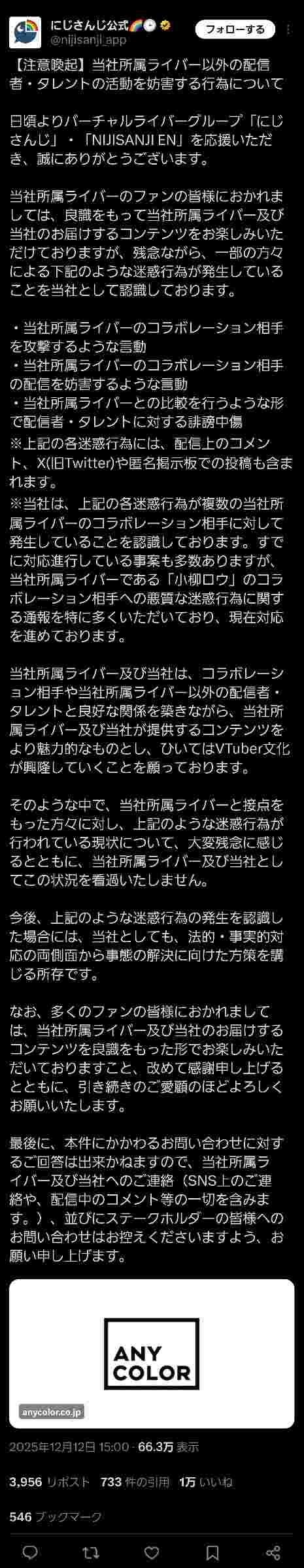 すでに対応進行している事案も多数ありますが、当社所属ライバーである「小柳ロウ」のコラボレーション相手への悪質な迷惑行為に関する通報を特に多くいただいており、現在対応を進めております。