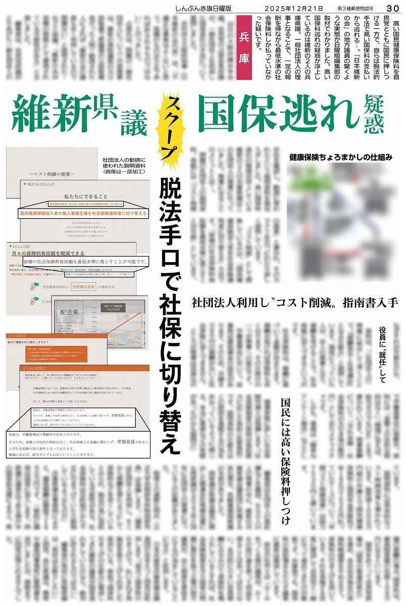 疑惑が浮上したのは維新の兵庫県議会議員団に所属する赤石理生、長崎寛親両県議。一般社団法人の理事に就任することで、一定の報酬を得ながら最低水準の社会保険料しか払っていなかった疑いです。
