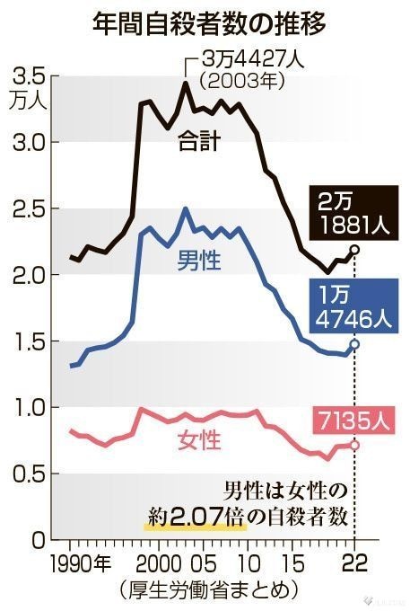 「男は生きづらい」は本当か、自死をめぐるアンバランス◆「女性の方が深刻」の指摘も #データの深層:時事ドットコム「日本の男性は女性の2倍も自殺している。女性よりもずっと、男性の方が生きづらい」ー。SNS上で、こんな意見を目にしたことがある。統計上は確かにその通り。だが、日本は本当に、男性の方が生きづらい社会なのだろうか。自死をめぐる男女差は、いったいどこから生じるのか。(時事ドットコム編集部 太田宇律)www.jiji.com - 5 : 2025/12/21(日) 17:08:52.53 ID:Tx9PM+cN0