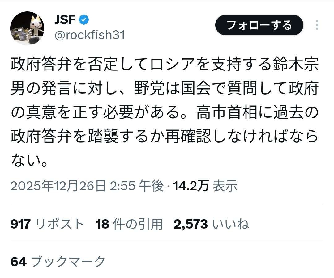 鈴木宗男氏、ロシア高官と面会 北方墓参再開、ウクライナ停戦訴え:時事ドットコムロシアを訪問中の自民党の鈴木宗男参院議員が26日、モスクワでルデンコ外務次官(アジア担当)らと面会した。ロシアのウクライナ侵攻などで途絶えた北方領土元島民の墓参再開を求め、早期停戦も働き掛けたもようだ。www.jiji.com - 2 : 2025/12/27(土) 20:41:00.59 ID:Cu6+P4iR0