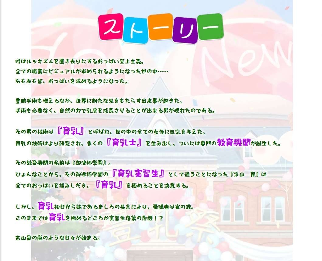 舞台となるのはルッキズムを置き去りにした、おぱーい至上主義の世の中。主人公は手術や薬に頼らず、手業によって乳房を大きくする育乳士の卵となり、生徒や教師、それ以外のヒロインのおぱーいを揉みまくる。驚きはヒロインの人数で、公式サイトで発表されているだけで23人。巨乳・爆乳が多いが、育乳しがいのある貧乳も混じっており、多様なおぱーいを楽しめる!
