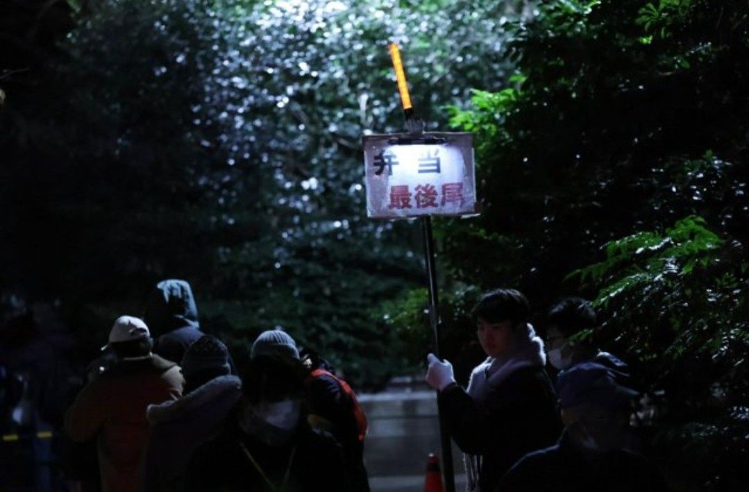 一方、通りの先、地上60階建ての高層ビル「サンシャイン60」の足元の公園では、違う景色が広がる。薄暗く電灯で照らされ、底冷えする寒さ。無言でじっと前を見つめたり、スマホに目を落としたりする約500人が列をなしていた。