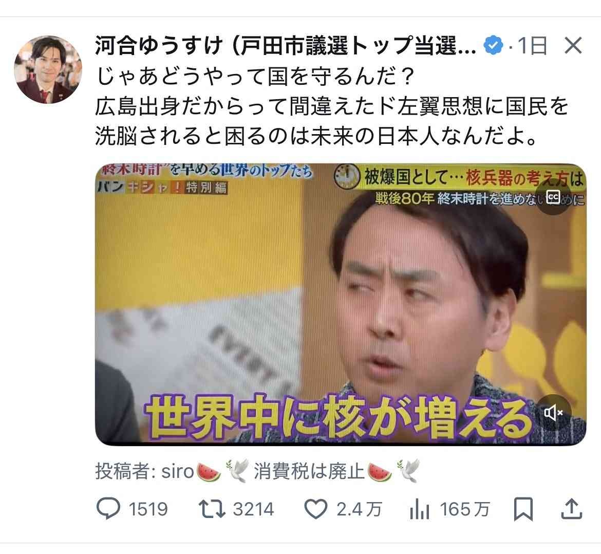 アメリカに反抗することになるからなこのピエ口河合ってのはすぐに「左翼だ左翼だ」連呼し始めるが、「じゃあお前はアメリカ大使館の前で「核兵器を持たせろ」ってどなってこい」で秒で論破できる いますぐ行け拡声器もってピエ口河合