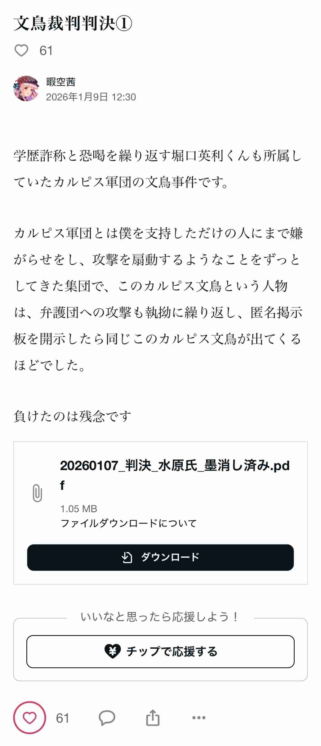 - これ、今日の導き親訴訟の敗訴の件じゃなくてこないだの文鳥の敗訴の件だよな