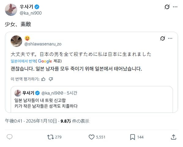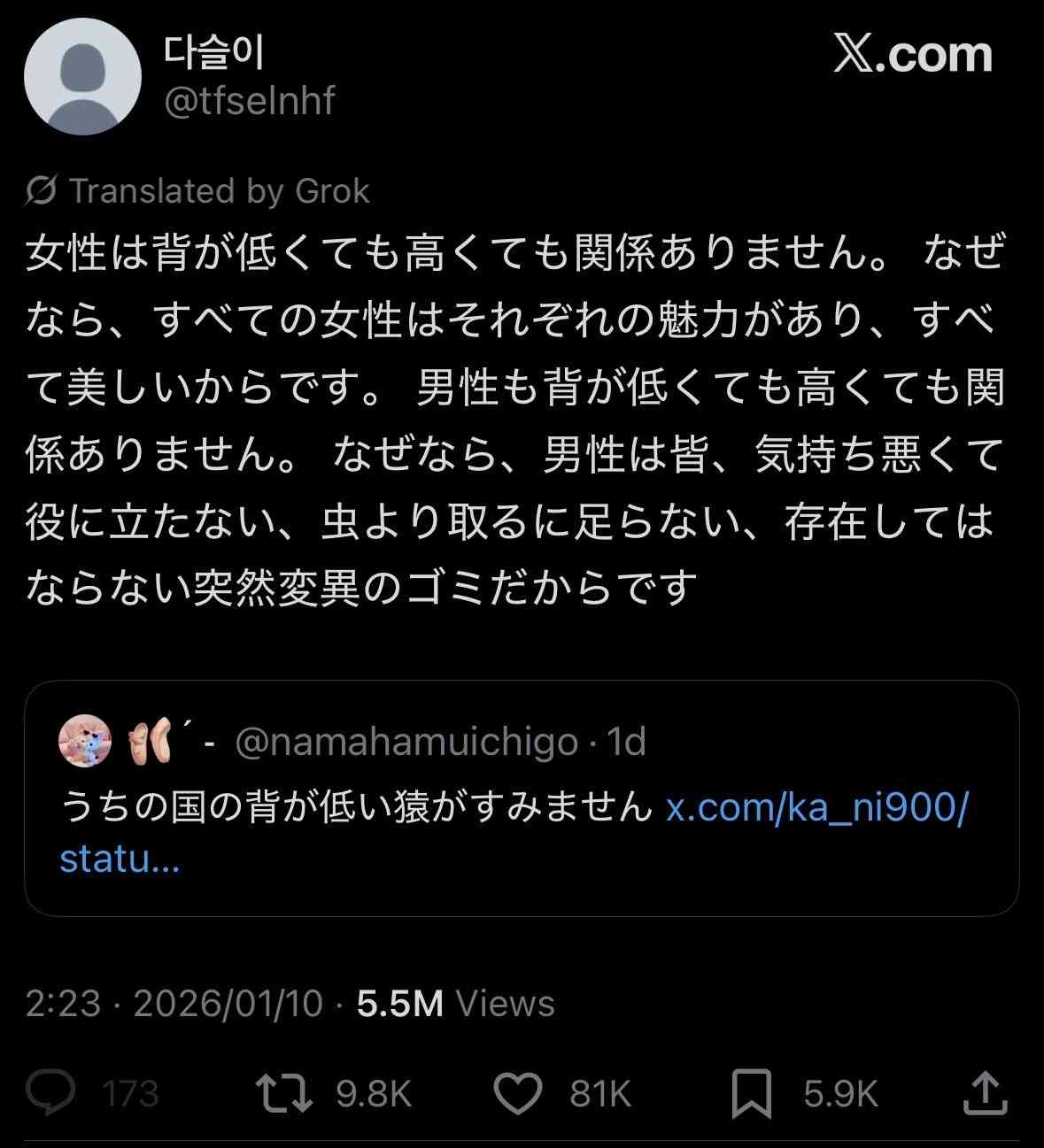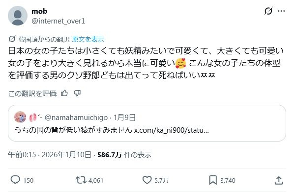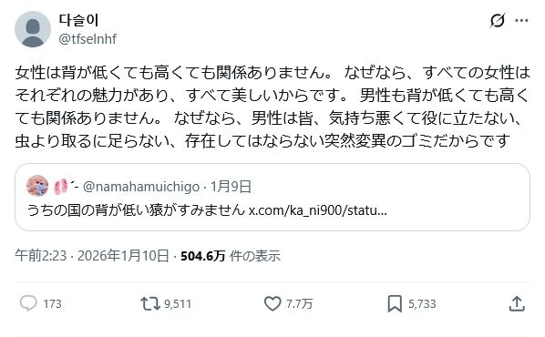 韓国男には同情しかない - 7 : 2026/01/10(土) 19:26:29.845 ID:bWZjqNJpR