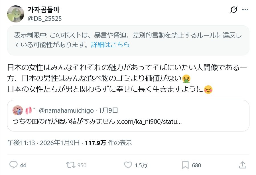 お前らのせいで日韓フェミ結託しちゃったね - 8 : 2026/01/10(土) 23:11:16.508 ID:VN3IzaiXN