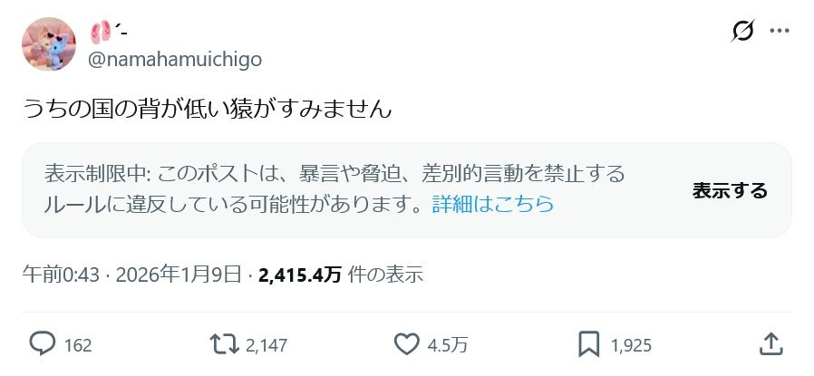 2枚目はまだ分かるけど1枚目はタレ地中のレベル超えてるだろ - 9 : 2026/01/10(土) 23:11:20.892 ID:WwvzovZvm