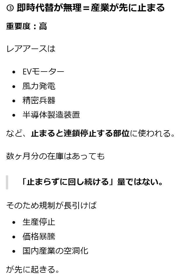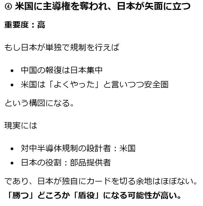 つまり、日本側からは証拠が無いしWHOの禁じ手なので同じ軍事転用で報復は無理となると「輸出認証手続きを遅らせる」ぐらいしか手が無いのでカードとしては弱すぎる