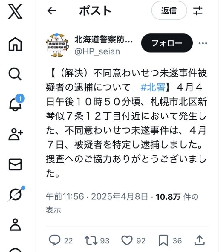 - 2025年4月4日午後10時50分ごろ、札幌市北区新琴似の駐車場にて、体調不良で休んでいた10代後半の女性に対し、「大丈夫ですか」などと声をかけ、体に触れた際に性的な部位に手を伸ばそうとした疑いが持たれています。女性は抵抗して逃げ、無事でした。