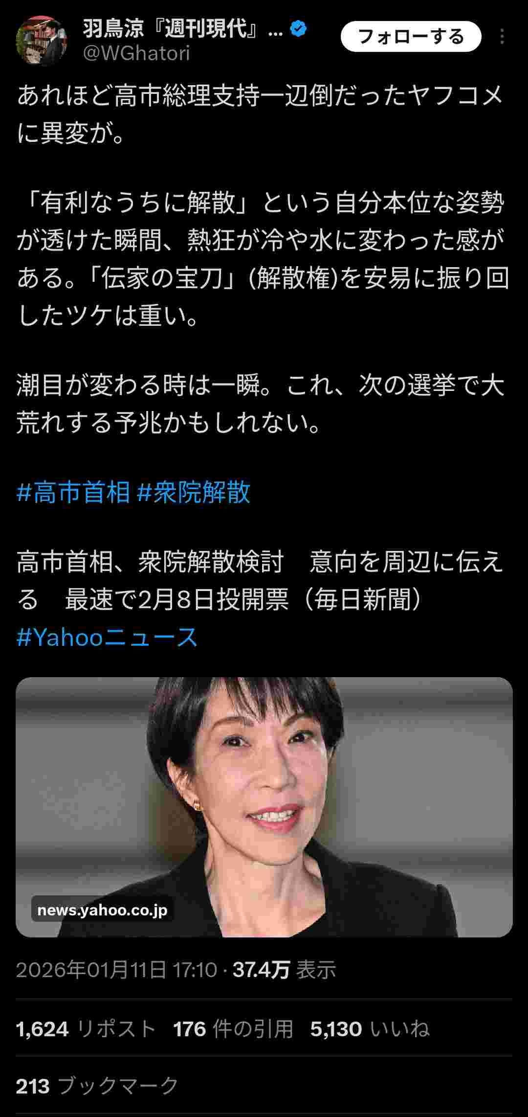 - サナ支持なら政策実現のために早期かつ有利なタイミングの解散を支持すべきやし