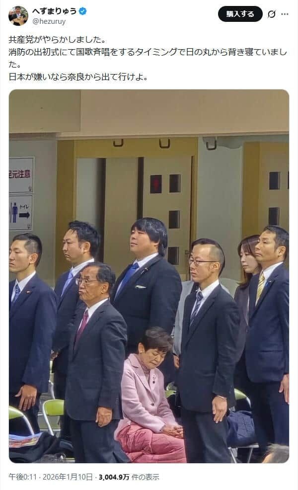 へずま氏は1月10日にXで、山村氏が市の消防出初式で「国歌斉唱をするタイミングで日の丸から背き寝ていました」として、周囲が起立するなか椅子に腰かけ、目をつむっている瞬間の写真を投稿。