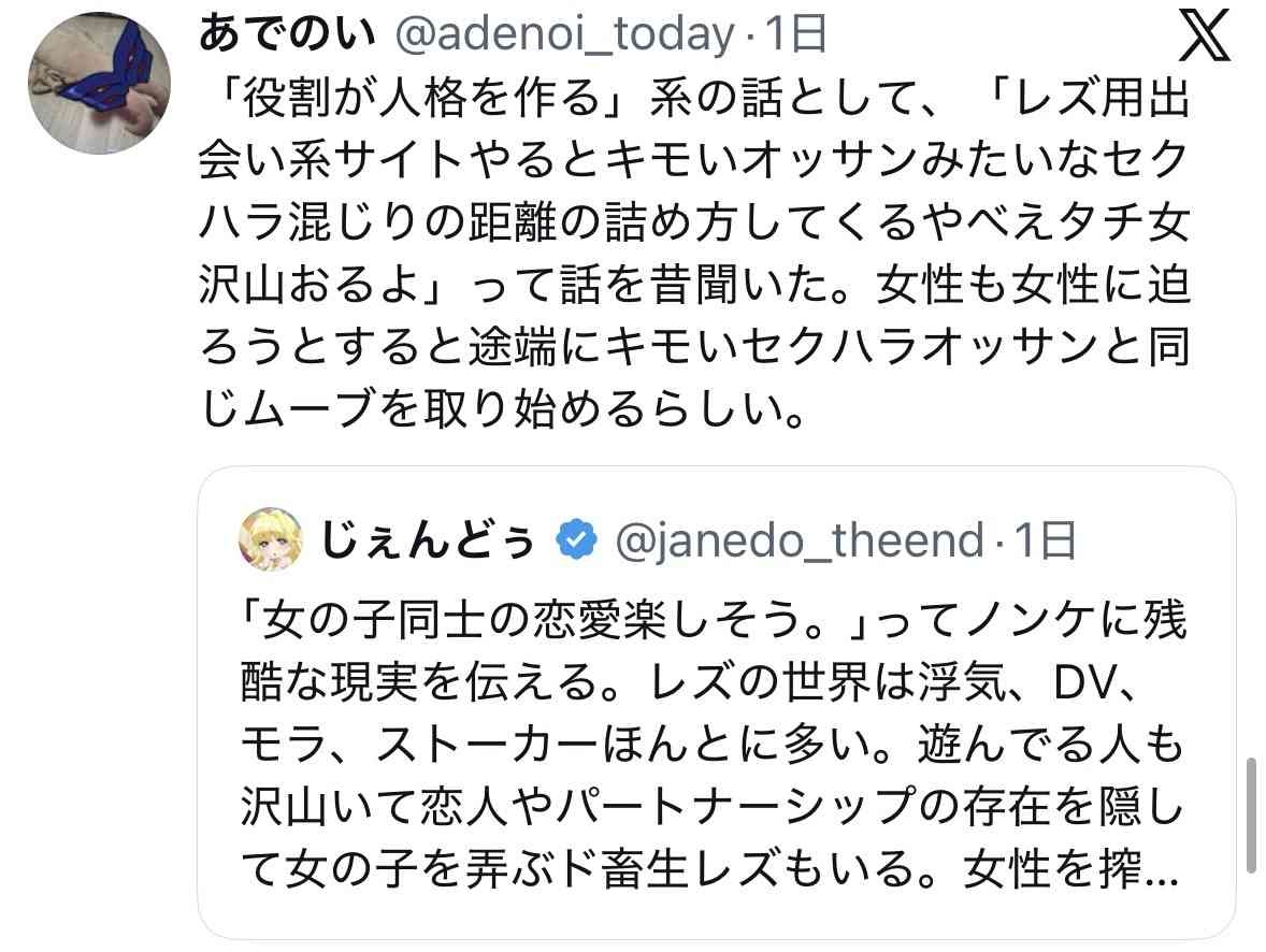 - 現実のレズカップルは片側に男役押し付けられるから創作の百合とは根本からして違うんだよね