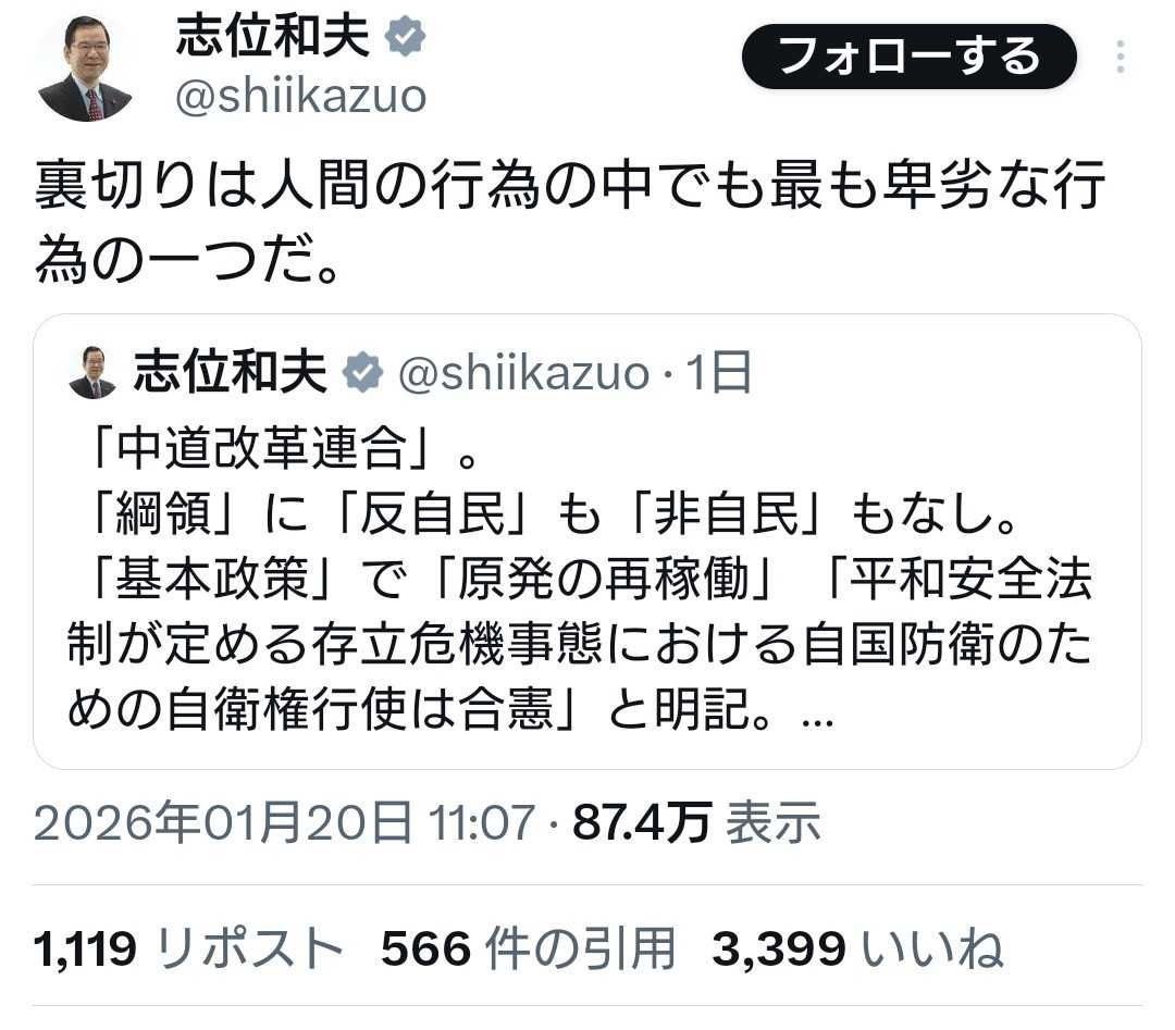 志位和夫 (@shiikazuo) on X裏切りは人間の行為の中でも最も卑劣な行為の一つだ。x.com - 3 : 2026/01/20(火) 18:18:43.15 ID:vifmFUzA0