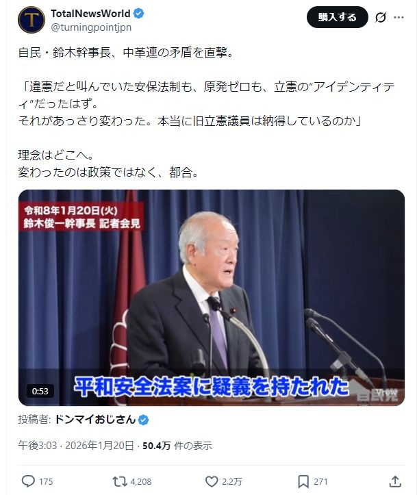 反原発、安保違憲派は別の政党を推すだろうから問題ない - 4 : 2026/01/21(水) 10:42:43.88 ID:NlRZyZ6X0