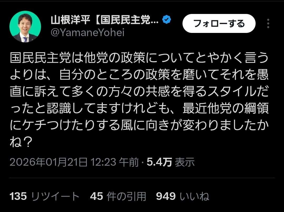 - > 国民民主党は他党の政策についてとやかく言うよりは、自分のところの政策を磨いてそれを患直に訴えて多くの方々の共感を得るスタイルだったと認識してますけれども、