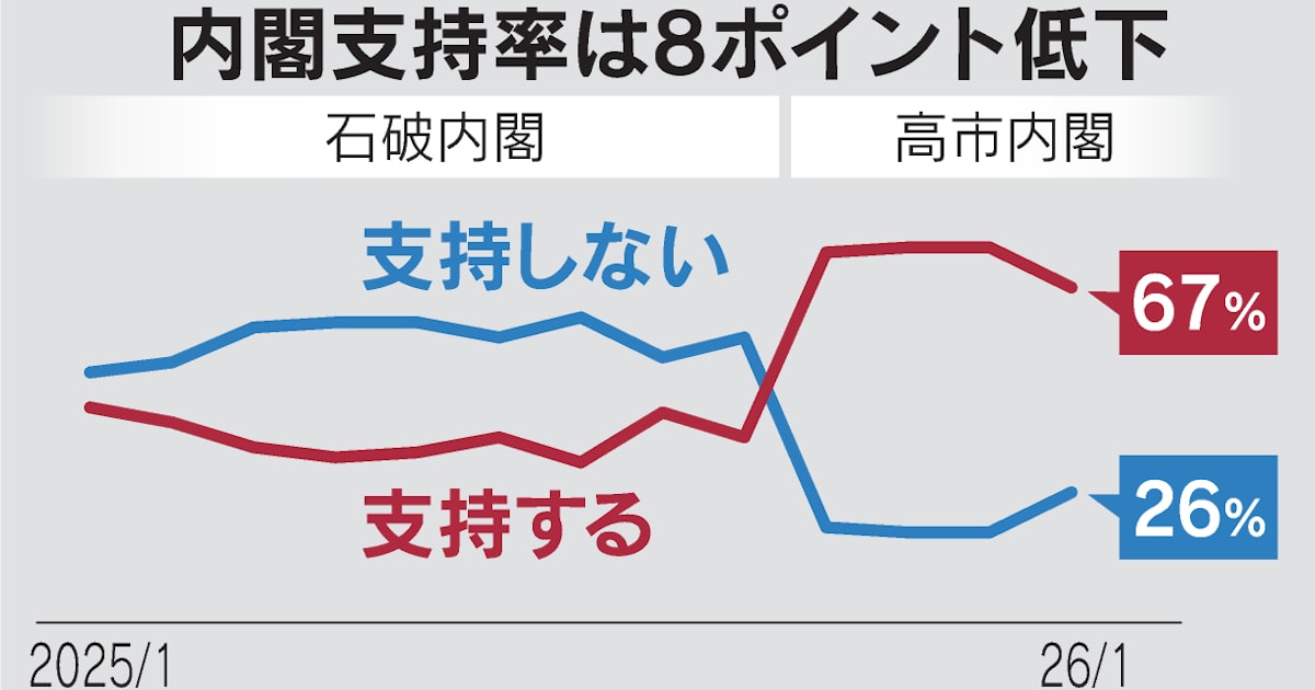 食品消費税ゼロ「物価高に効果なし」56% 高市内閣支持67%に低下 - 日本経済新聞日本経済新聞社とテレビ東京は23〜25日に世論調査を実施した。高市早苗内閣の支持率は67%と2025年12月の前回調査の75%から8ポイント低下した。内閣を「支持しない」は26%で、前回の18%から8ポイント上昇した。10月の内閣発足後、初めて内閣支持率が7割を割った。自民党と日本維新の会の連立与党、立憲民主党と公明党...www.nikkei.com - 3 : 2026/01/26(月) 01:50:55.40 ID:XOJE241e0